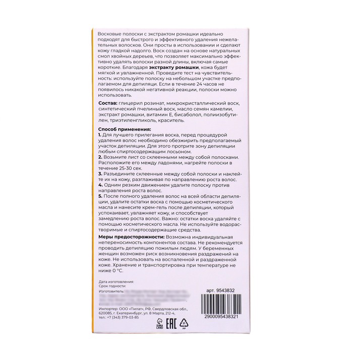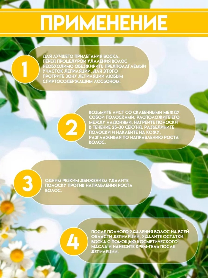 Восковые полоски с экстрактом ромашки идеально подходят для быстрого и эффективного удаления нежелательных волосков на любом участке тела. Они просты в использовании и сделают кожу гладкой надолго. Воск создан на основе натуральных смол хвойных дереьев, что позволяет максимально эффективно удалять волоски разной длины, включая самые короткие. Благодаря экстракту ромашки и витамина Е, кожа будет мягкой и увлажненной. Проведите тест на чувствительность: используйте полоску на небольшом участке предполагаемом для депиляци. Если в течение 24 часов не появилось никакой негативной реакции, полоски можно использовать.