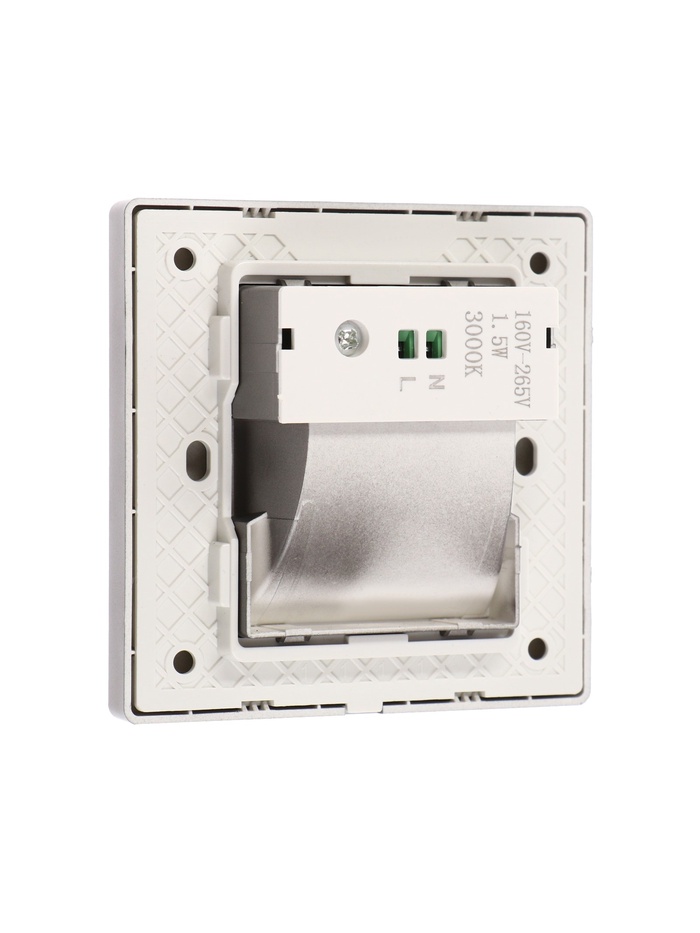 Светильник излучает тёплый белый свет с цветовой температурой 3000К, создавая мягкое и приятное освещение, которое идеально подходит для использования в вечернее и ночное время. Его компактные размеры (86×86 мм) и скрытый способ монтажа позволяют гармонично встроить его в ступени или стены, сохраняя эстетичный вид интерьера.