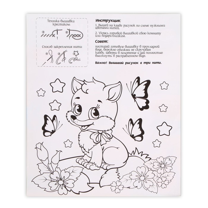 Небольшая вышивка с простым узором и цветной схемой — то, что нужно малышу, чтобы освоить новое хобби.