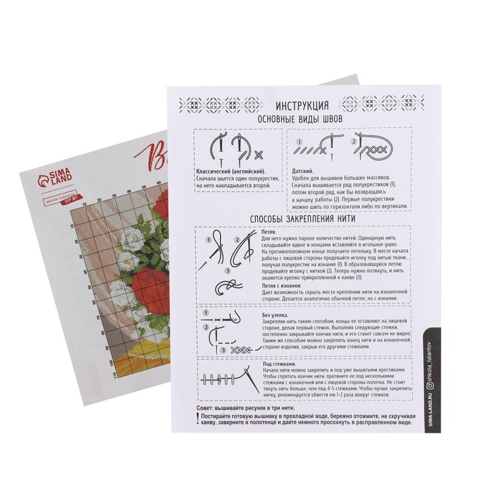 • В инструкции подробно описаны стежки и варианты закрепления нити, которые можно использовать во время творческого процесса.