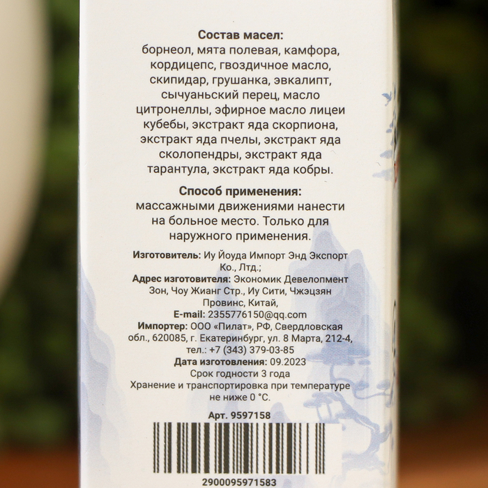 Состав: борнеол, мята полевая, камфора, кордицепс, гвоздичное масло, скипидар, грушанка, эвкалипт, сычуаньский перец, масло цитронеллы, эфирное масло лицеи кубебы, экстракт яда скорпиона, экстракт яда пчелы, экстракт яда сколопендры, экстракт яда тарантула, экстракт яда змей.