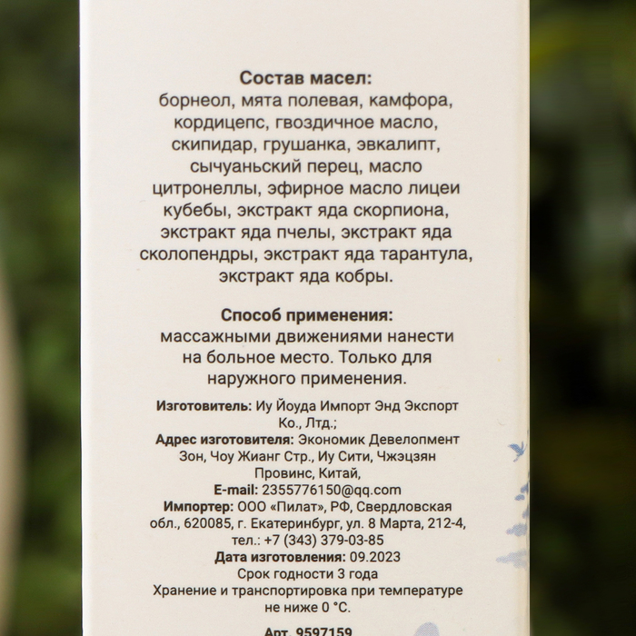 Состав: борнеол, мята полевая, камфора, кордицепс, гвоздичное масло, скипидар, грушанка, эвкалипт, сычуаньский перец, масло цитронеллы, эфирное масло лицеи кубебы, экстракт яда скорпиона.