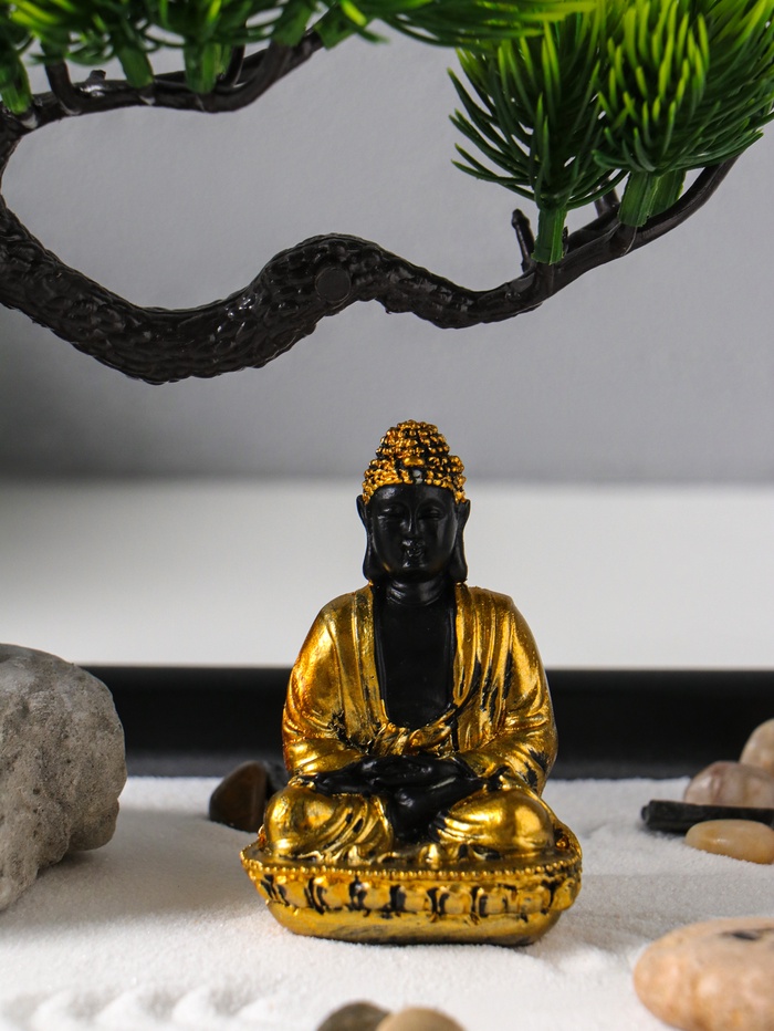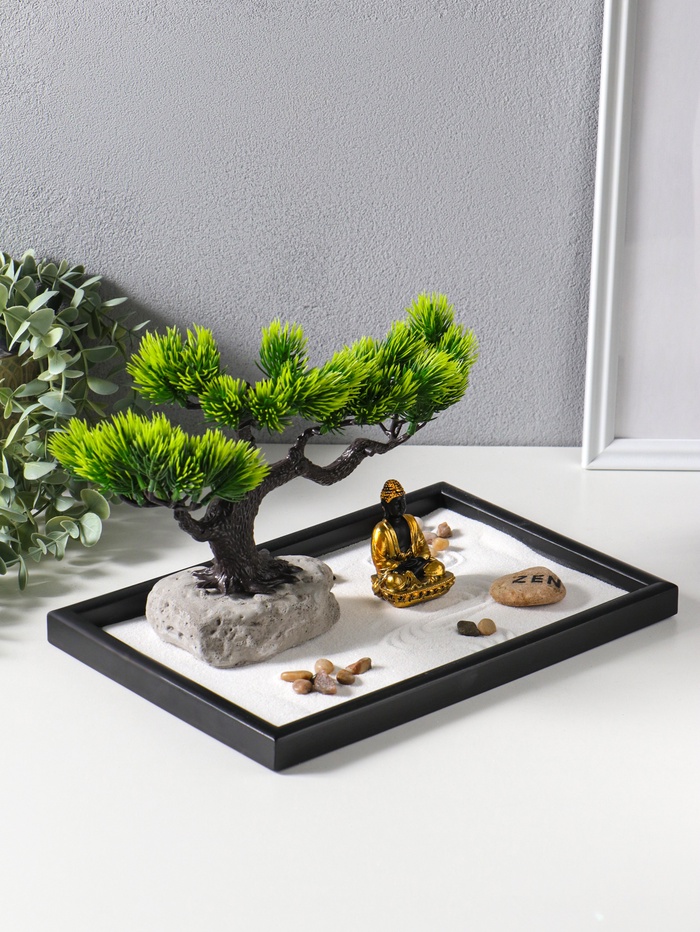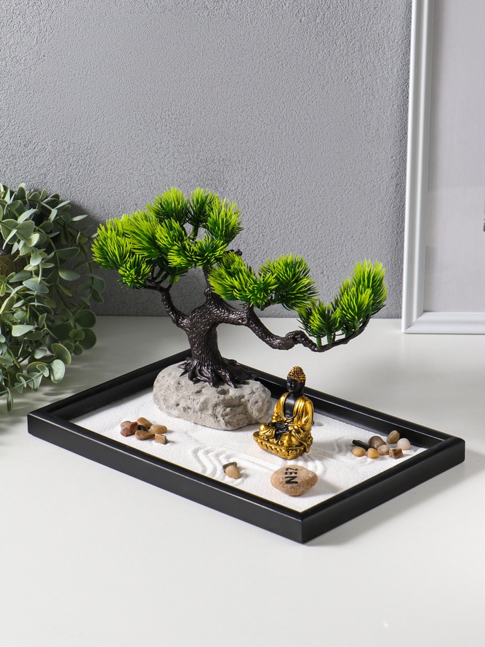 Этот настольный сад камней — личное пространство для медитации и созерцания. Композиция с фигурой Будды под деревом создаёт глубокий символ умиротворения и мудрости. Каждый элемент, от гладких камней до деталей ландшафта, приглашает к практике осознанности, помогая отвлечься от суеты и обрести внутренний баланс прямо за рабочим столом или в домашнем уголке для отдыха.