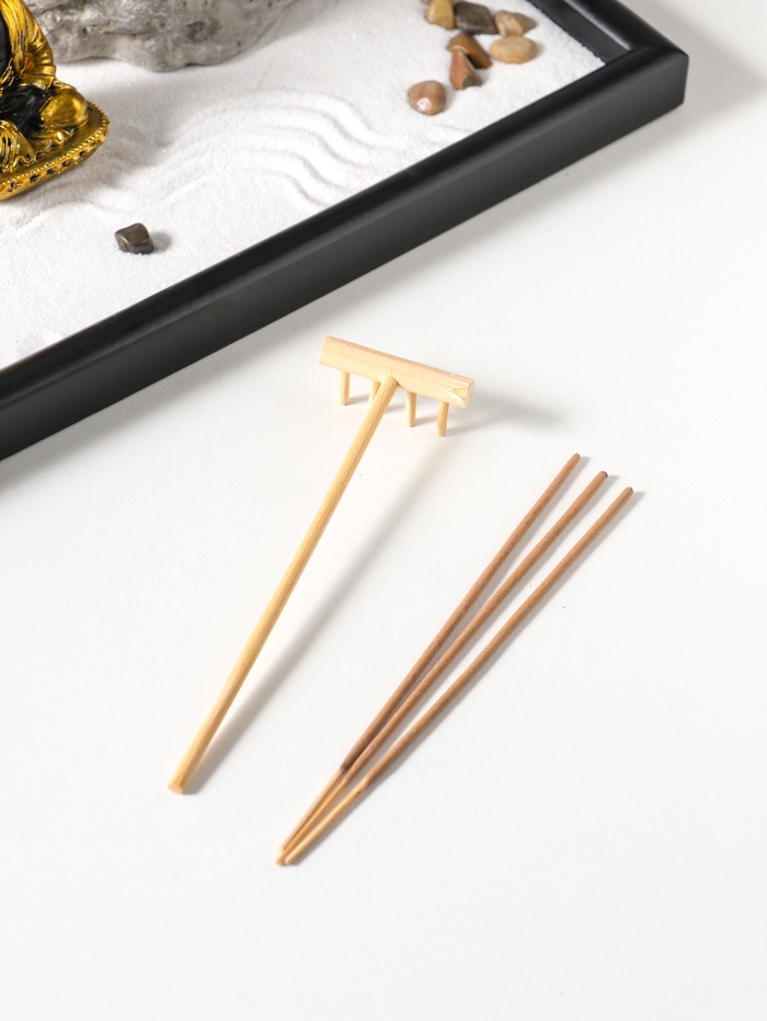 Работа с песком и камнями успокаивает ум, а ритуал использования благовоний помогает настроиться на практику. Этот миниатюрный дзен-сад становится инструментом для ежедневной паузы, визуальным якорем, возвращающим внимание к себе. Это больше, чем декор — это персональный ритуал, который помогает снизить стресс и восстановить душевное равновесие в течение дня.