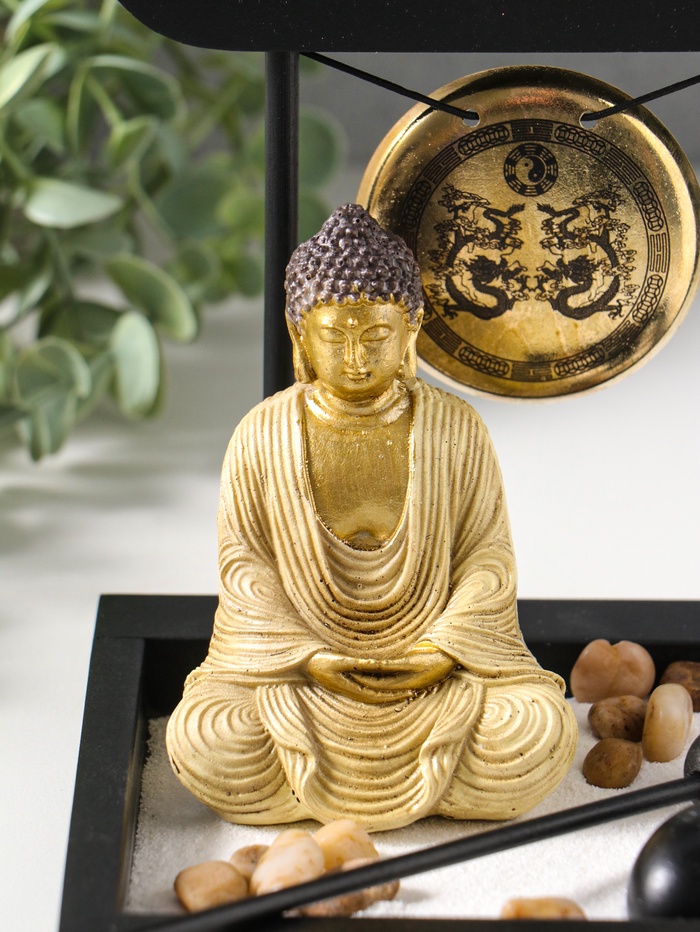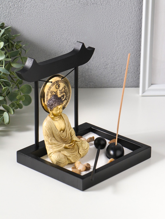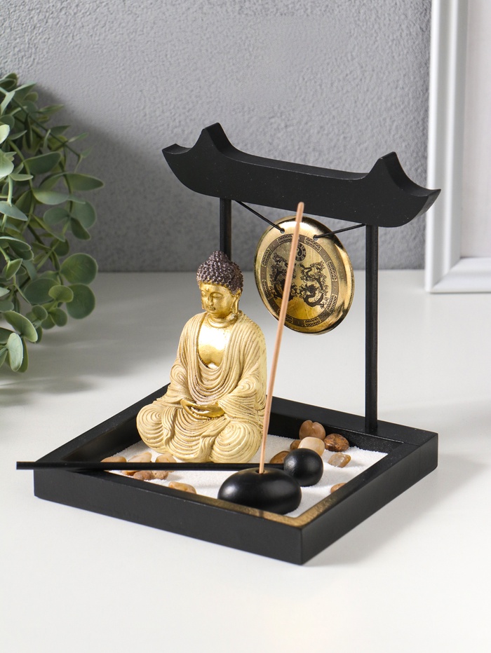 Этот настольный сад камней с фигуркой Будды — личный уголок спокойствия для вашего дома или офиса. Миниатюрный ландшафт с гонгом и подставкой для благовоний создаёт пространство для медитации, снятия стресса и сосредоточения. Каждый элемент композиции приглашает к созерцанию и неспешному ритуалу, помогая отвлечься от суеты и обрести внутренний баланс.