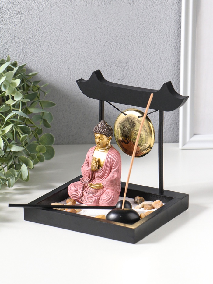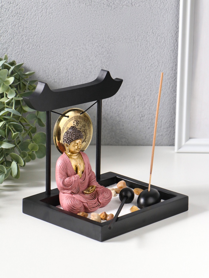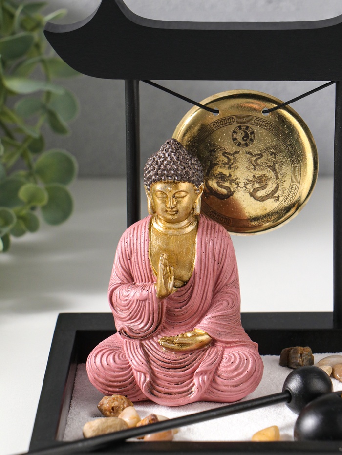 Японский сад камней настольный «Дзен. Будда в розовом у гонга», с подставкой для благовоний и набором аксессуаров, 13.2×15×16 см