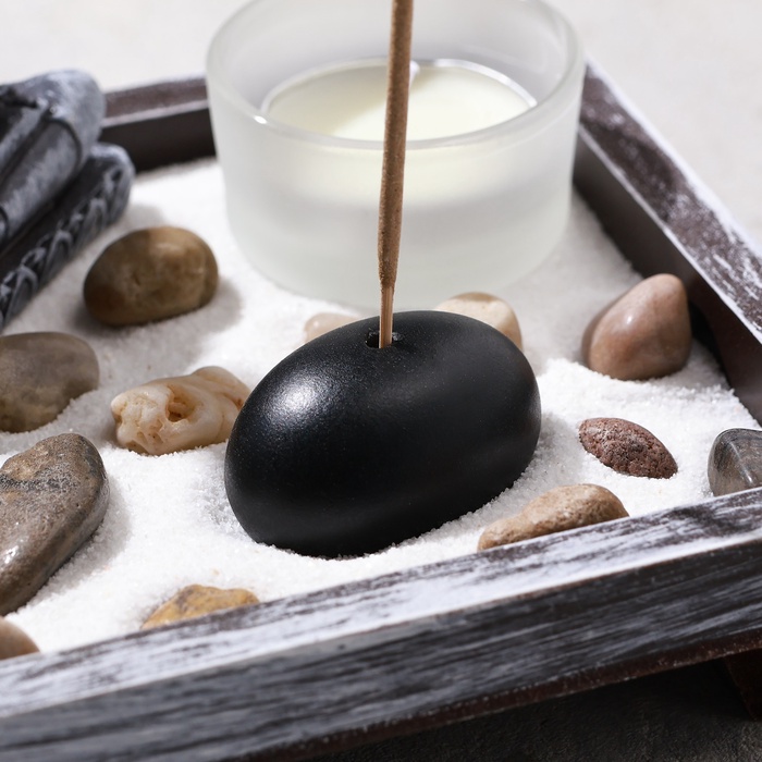 Этот сад камней — не просто декоративный элемент, а инструмент для медитации и релаксации. Он помогает сосредоточиться, снять напряжение и найти вдохновение в повседневной жизни. Использование благовоний усиливает эффект, создавая атмосферу уюта и спокойствия. Такой набор станет идеальным подарком для ценителей восточной философии или стильным акцентом в вашем доме.