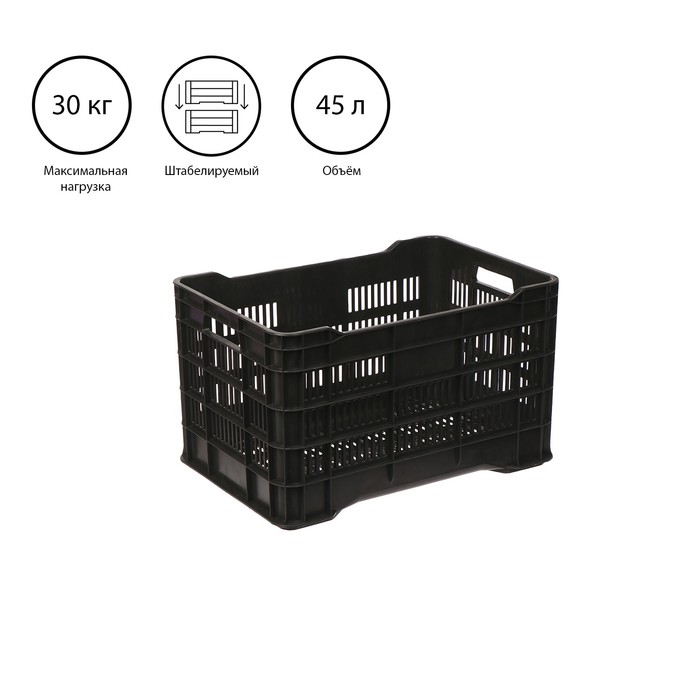 Большое количество утолщённых рёбер на стенках и на дне позволяют штабелировать гружёные ящики стопкой до 7 штук.