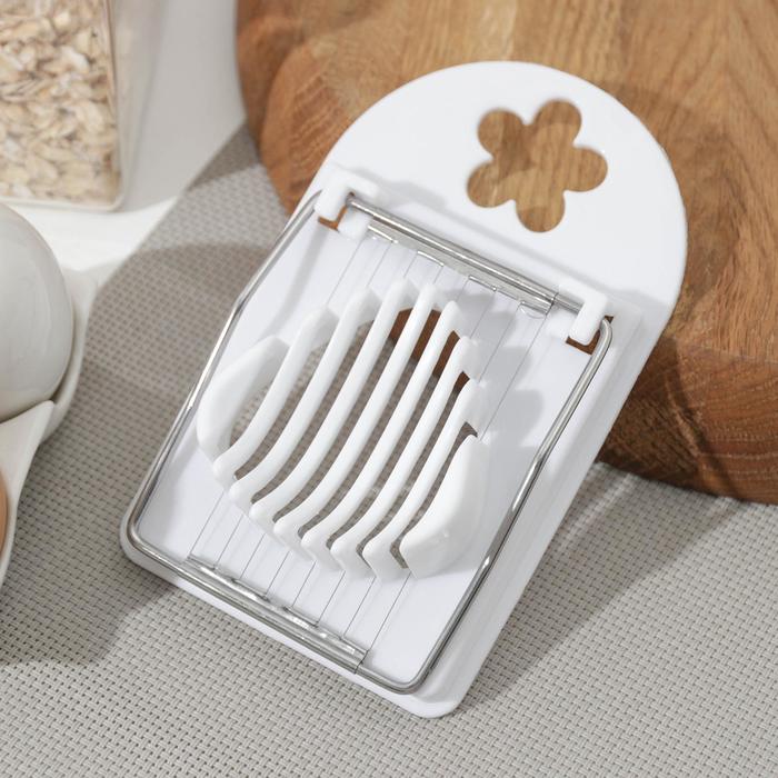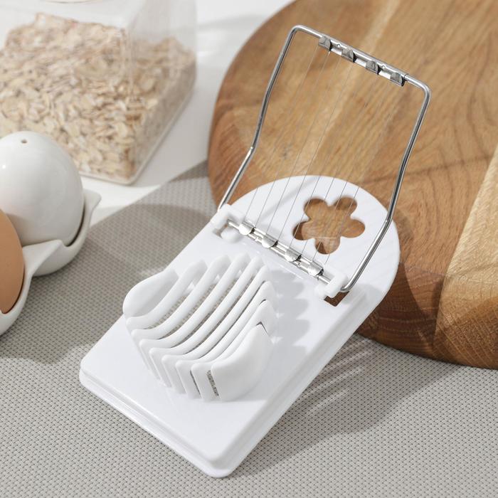 Яйцерезка изготовлена из прочного пластика и имеет металлические лезвия, которые обеспечивают чистый и ровный срез. Яйцерезка имеет компактный размер и удобна в хранении.