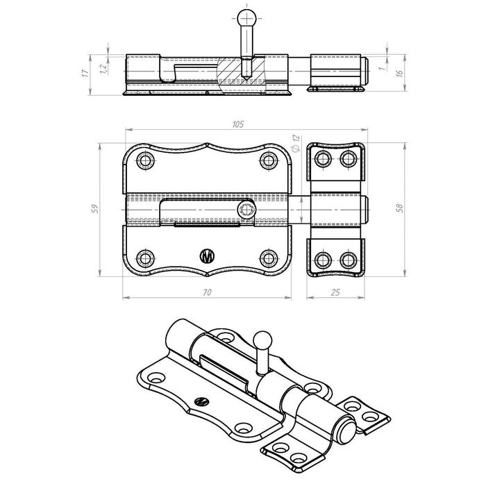 - Длина 105 мм: Подходит для стандартных межкомнатных дверей, подсобных помещений и уличных калиток. Засов полностью перекрывает дверной проём при закрывании.