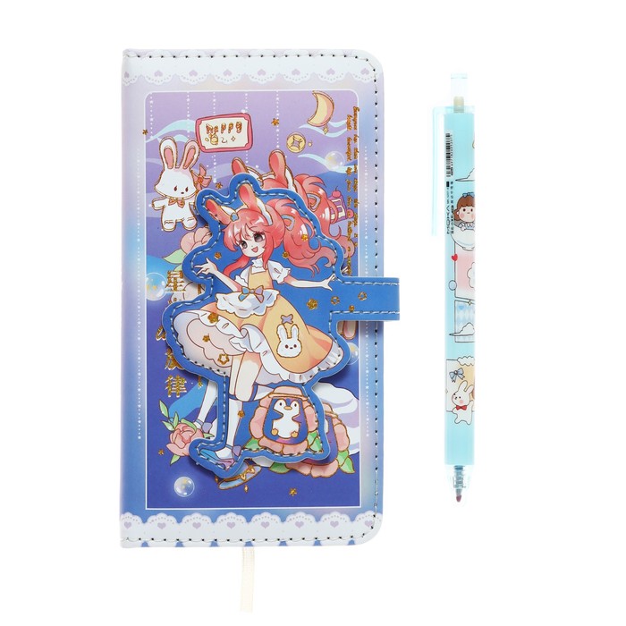 Записная книжка в подарочной коробке, А6, с фигурным хлястиком, обложка пвх, с ручкой "Аниме", МИКС