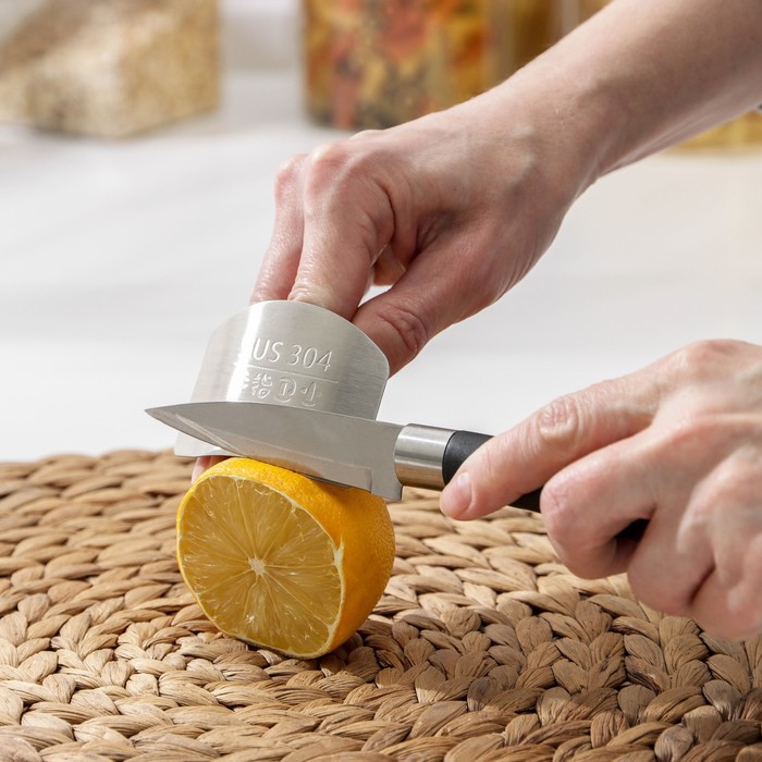 - Приспособление в виде пластины из нержавеющей стали предназначено для защиты пальцев рук от порезов кухонным ножом, пригодится всем на кухне.