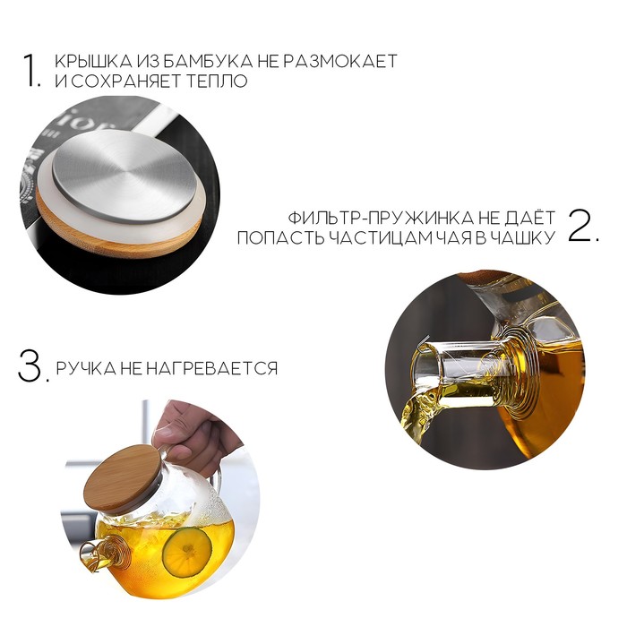 Этот чайник с прозрачным дизайном и бамбуковой крышкой становится частью кухонного обихода, где натуральный сито и стекло создают сбалансированный подход к завариванию. Он подходит тем, кто ценит простоту без усложнений.