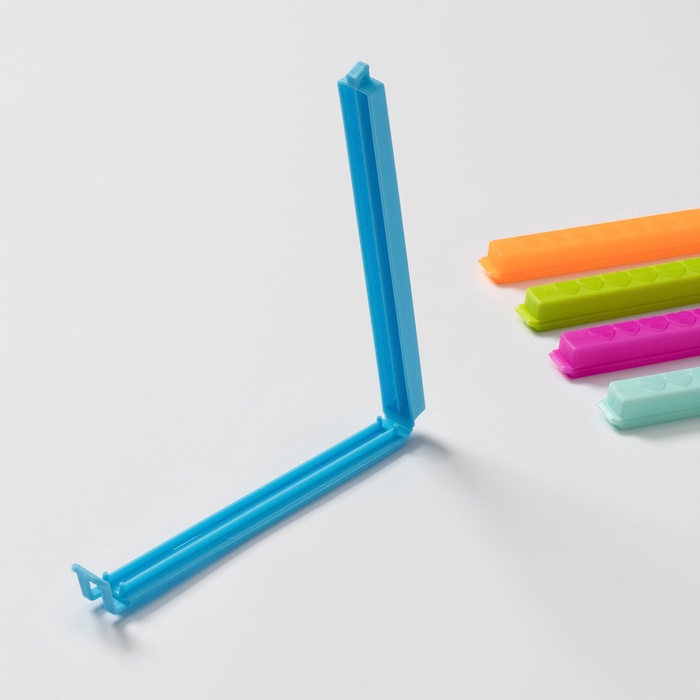 Набор состоит из 5 зажимов разных цветов, изготовленных из прочного пластика. Они легко и надежно закрепляются на пакетах любого размера и не скользят.