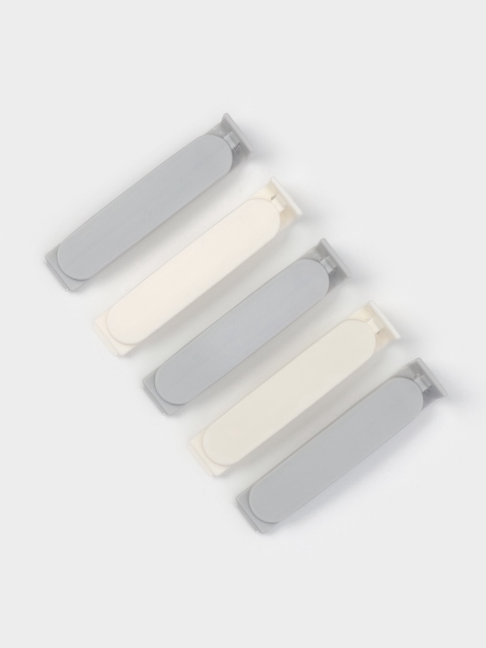 В наборе вы получите 5 зажимов, выполненных в элегантных белом и сером цветах, которые легко впишутся в любой интерьер. Изготовленные из прочного пластика, они обеспечивают надежное закрытие пакетов, предотвращая попадание воздуха и влаги.