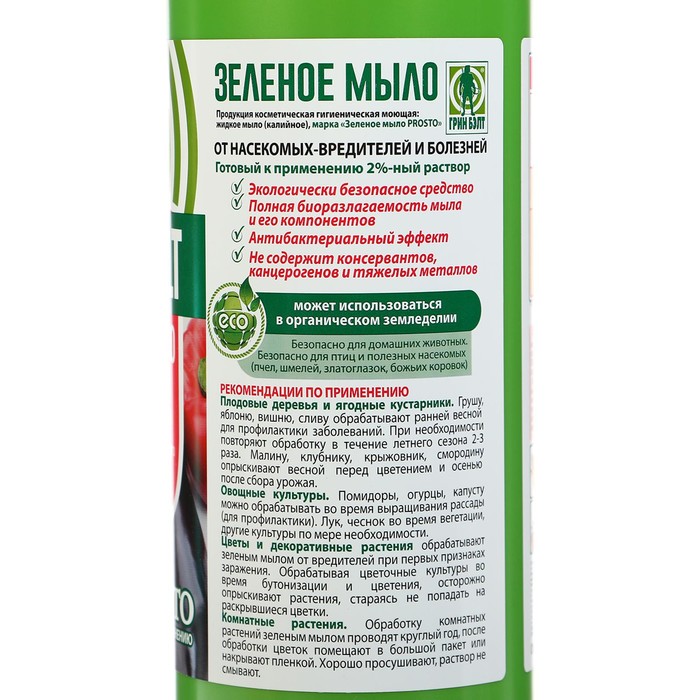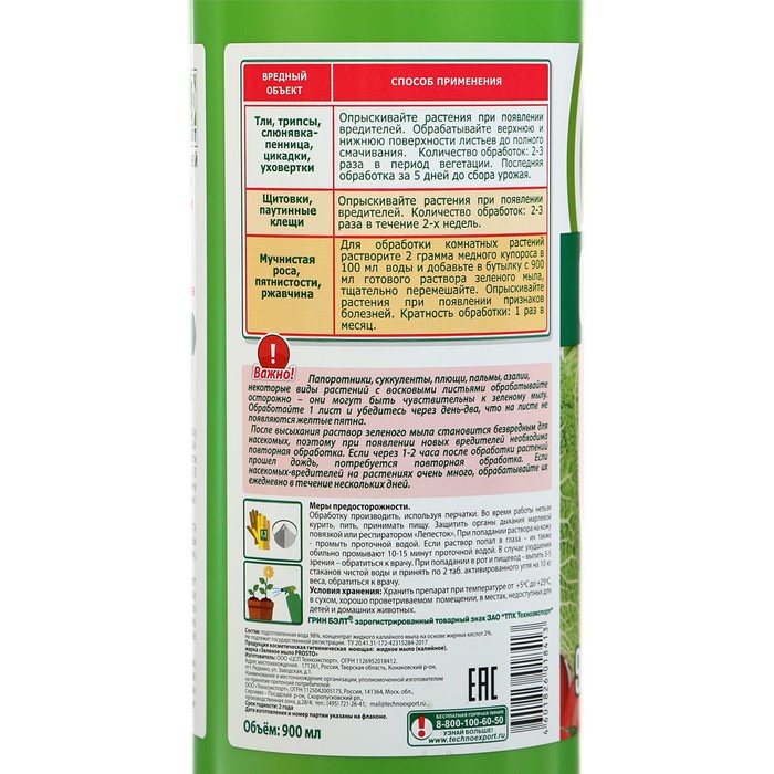 Рекомендации по применению: Грушу, яблоню, вишню, сливу обрабатывают ранней весной, для профилактики заболеваний. При необходимости повторяют обработку в течение летнего сезона 2-3 раза. Малину, клубнику, крыжовник, смородину опрыскивают весной, перед цветением и осенью, после сбора урожая. Помидоры, огурцы, капусту можно обрабатывать во время выращивания рассады (для профилактики). Лук, чеснок во время вегетации, другие культуры по мере необходимости. Цветы и декоративные растения обрабатывают зеленым мылом от вредителей при первых признаках заражения. Обрабатывая цветочные культуры во время бутонизации и цветения, осторожно опрыскивают растения, стараясь не попадать на раскрывшиеся цветки. Обработку комнатных растений зеленым мылом проводят круглый год, после обработки цветок помещают в большой пакет или накрывают пленкой. Хорошо просушивают, раствор не смывают.