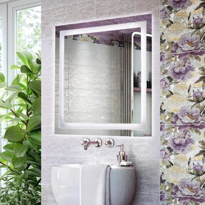 Зеркало оснащено встроенным светодиодным светильником размещенным по периметру и сенсорной кнопкой включения подсветки.