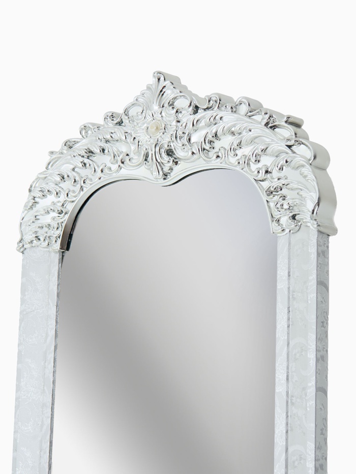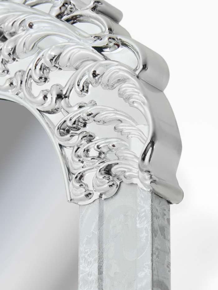 - Элегантный дизайн: высокое зеркало с изогнутой формой и декоративной рамой придаёт ему утончённый и роскошный вид.