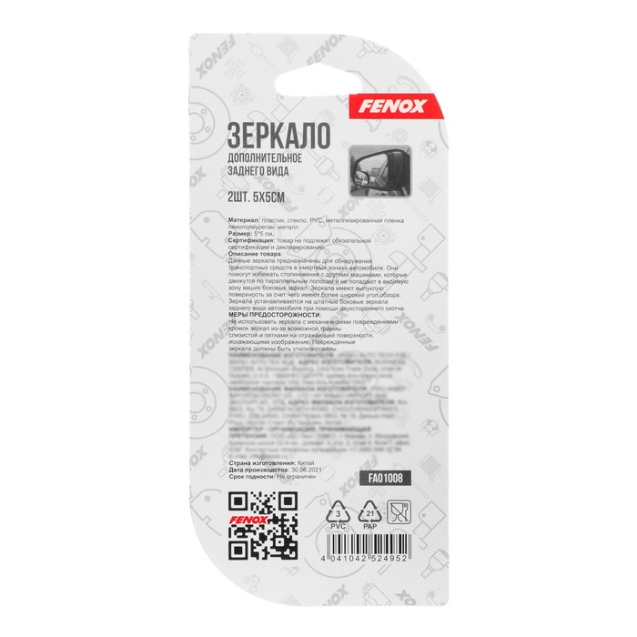 Зеркала слепой зоны FENOX предназначены для обнаружения транспортных средств в «мертвых зонах» автомобиля. Данное изделие призвано помочь в предупреждении столкновения с автомобилями, движущимися по параллельным полосам и не попадающих в зону видимости боковых зеркал. Зеркала контроля слепых зон FENOX предлагаются в разных формах и размерах и подойдут практически для любых автомобилей. Специальная выпуклая поверхность изделий обеспечивает более широкий угол обзора. Крепятся на боковые зеркала при помощи двустороннего скотча.