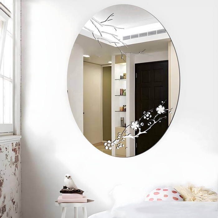Особенность данного изделия заключается в его уникальном дизайне, который представлен в виде вставок, имитирующих ветви деревьев и распускающиеся цветы. Эта композиция создает впечатление весеннего цветения, напоминая о нежном и романтичном образе японской сакуры. Такое оформление прекрасно впишется в любой интерьер, придавая ему легкую восточную ноту и атмосферу свежести. Интерьерные наклейки, входящие в комплект, позволяют легко и быстро закрепить зеркало на стене, избегая необходимости использования гвоздей или шурупов. Это значительно упрощает процесс монтажа и дает возможность менять местоположение декора по своему усмотрению.