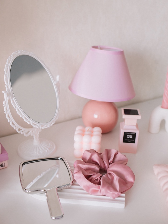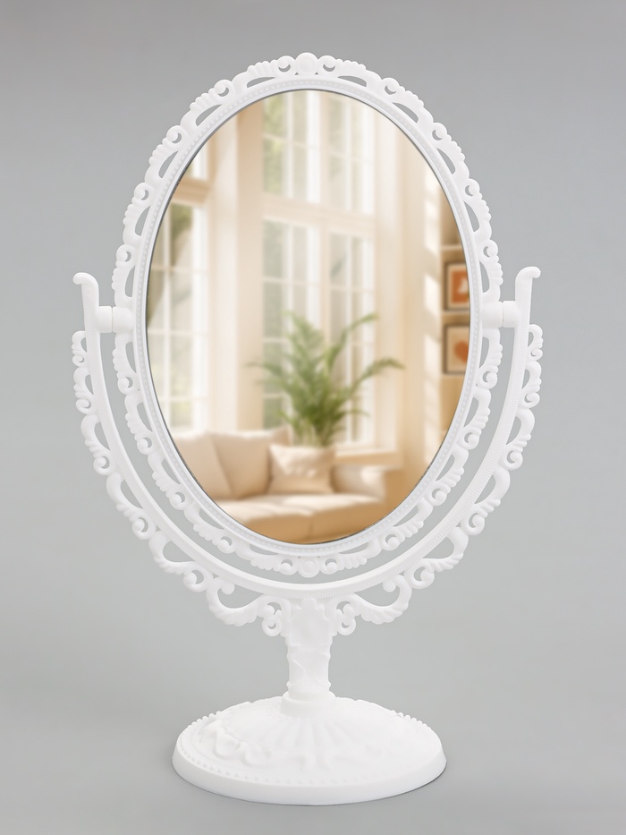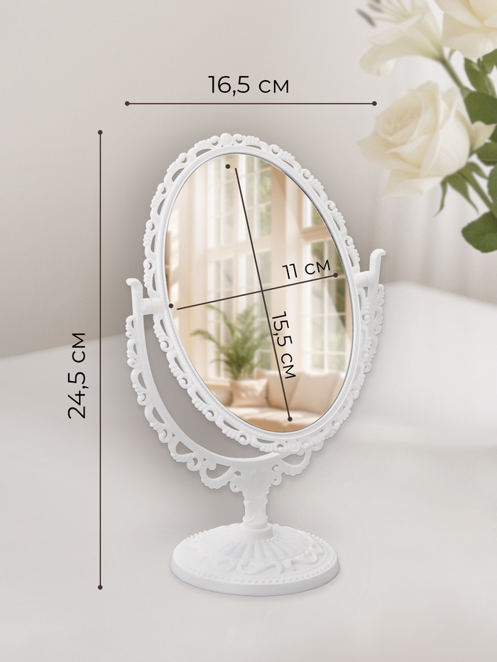 Изящное зеркало на ножке — украшение для туалетного столика. Конструкция не расшатывается и устойчиво держится на поверхности. Увеличивающая линза пригодится, чтобы рассмотреть детали макияжа.