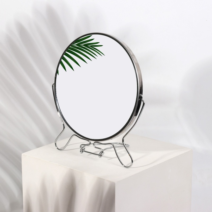 Двустороннее круглое зеркало с увеличением х2 и серебристой металлической рамой сочетает настольный и подвесной варианты установки. Диаметр зеркальной поверхности 16 см обеспечивает комфортный обзор, а поворотный механизм упрощает переключение между обычным и увеличенным отражением. Компактные размеры и универсальный дизайн подходят для ванной, спальни, прихожей и гостиной.