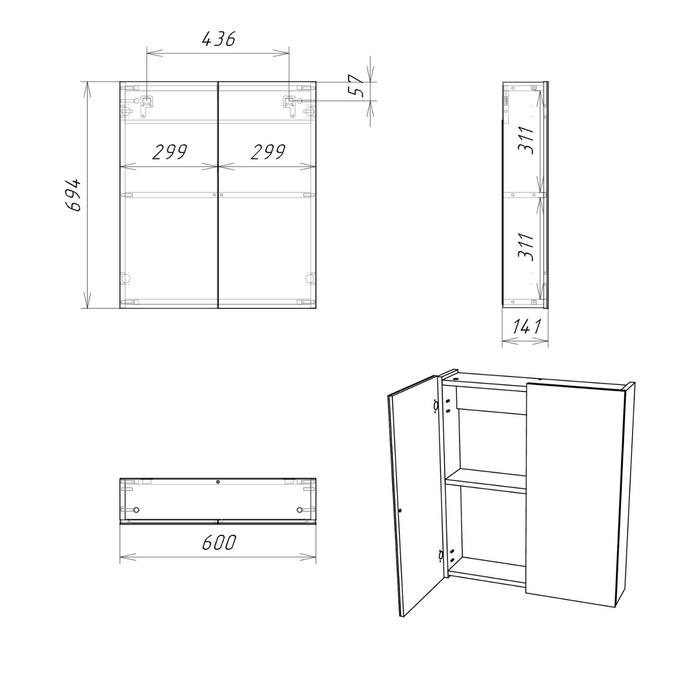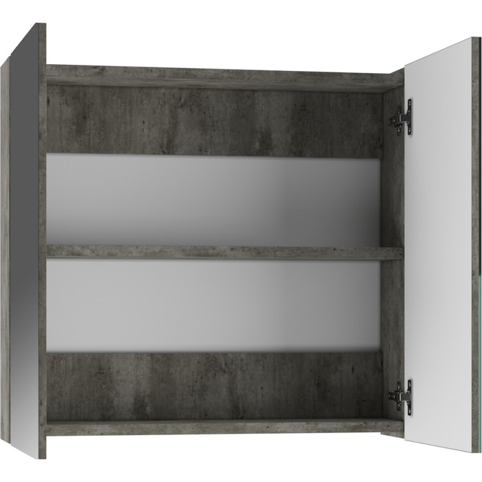 Шкаф-зеркало имеет две распашные дверцы, на каждой из которых расположено зеркало. Это позволяет экономить пространство и обеспечивает удобство использования.