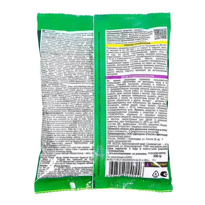 Назначение: для уничтожения крыс и мышей в жилых помещениях и хозяйственных постройках.