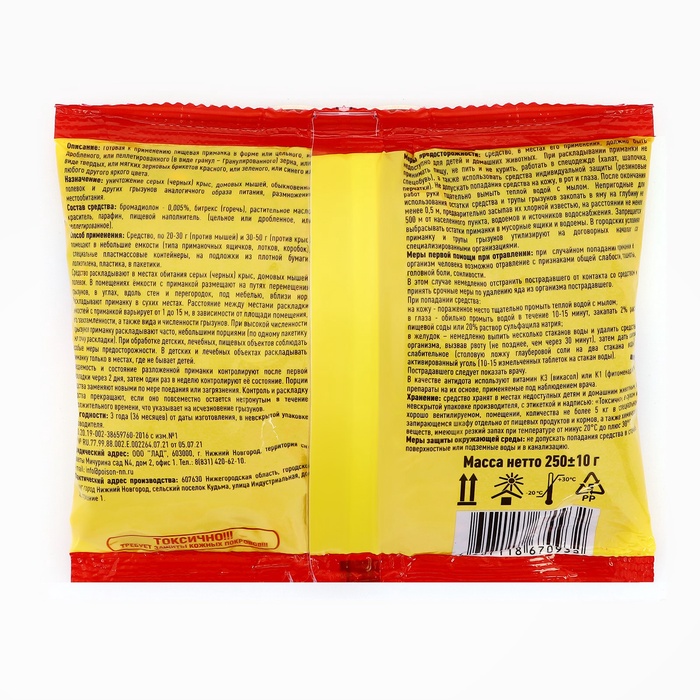 Грамотно разработанный состав приманки уверенно привлекает внимание грызунов, обеспечивая быстрое избавление от проблемы. Зерновая структура помогает в эффективном распространении и применении.