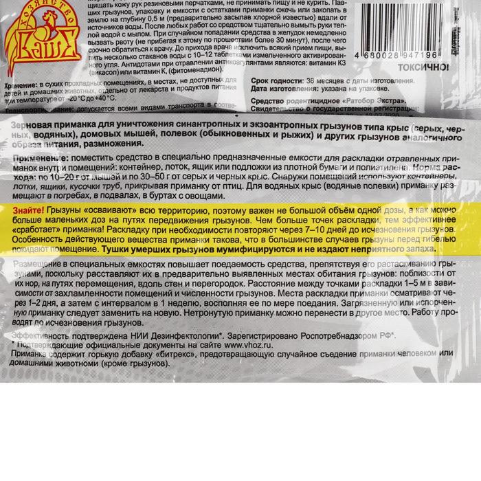 Меры предосторожности и первой помощи: во время раскладки средства защищать кожу рук резиновыми перчатками, не принимать пищу и не курить. Павших грызунов, упаковку и емкости с остатками приманки сжечь или закопать в землю на глубину 0,5 м (предварительно засыпав хлорной известью) вдали от источников воды. После любых работ со средством тщательно вымыть руки теплой водой с мылом. При попадании на кожу - тщательно промыть водой с мылом, в глаза - обильно промыть водой или 2% раствором пищевой соды, после чего закапать 1-2 капли 20-30% раствора сульфацила натрия. При случайном попадании средства в желудок немедленно (не позднее 30 мин) вызвать рвоту. Исключить всякий прием пищи, выпить несколько стаканов воды с 10-12 таблетками измельченного активированного угля. При развитии симптомов интоксикации немедленно обратиться к врачу. Антидоты: витамин К3 (викасол) или витамин К, (фитоменадион).
