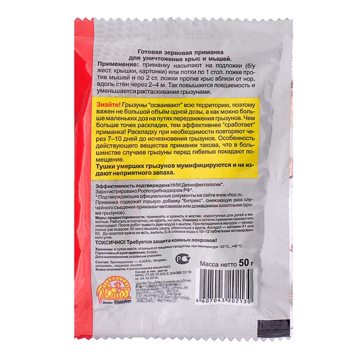 Готовая приманка для уничтожения крыс и мышей. Охотно поедается крысами и мышами, легко распределяется ими между собой; зерно для грызунов — корм привычный, поэтому начало поедания приманки после раскладки очень быстрое. Тушки умерших грызунов мумифицируются и не издают неприятного запаха.