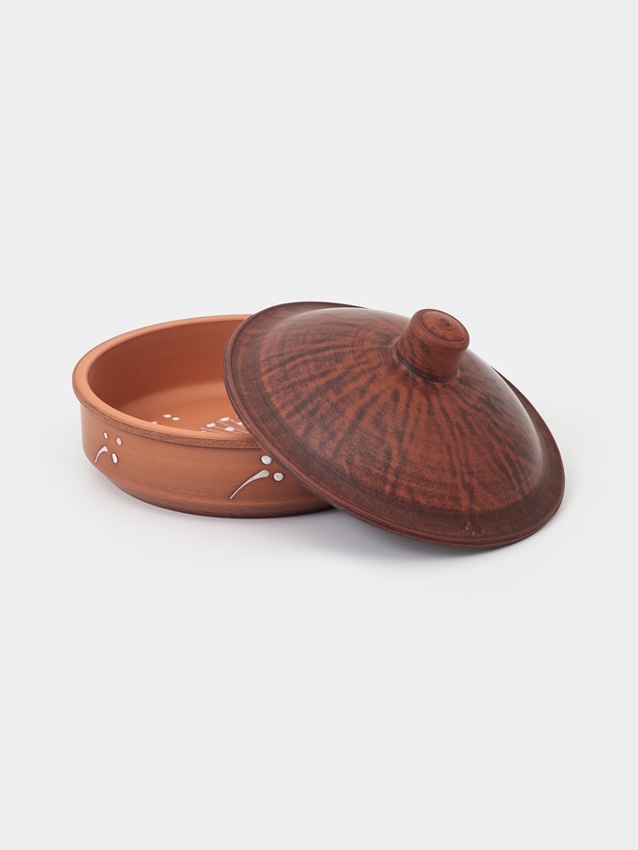 Изделие выполнено из экологичной красной глины, которая равномерно распределяет тепло и долго его удерживает. Благодаря крышке внутри создается эффект томления — блюда получаются особенно сочными, мягкими и насыщенными вкусом. Натуральный коричнево-красный оттенок и декоративный узор «одуванчик» придают жаровне уютный и традиционный вид.