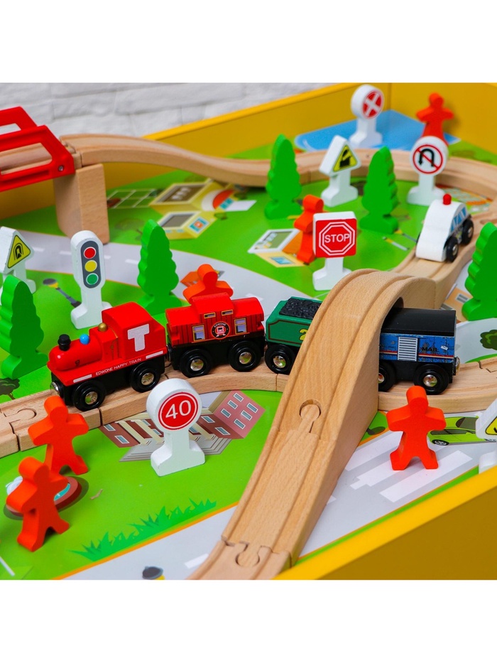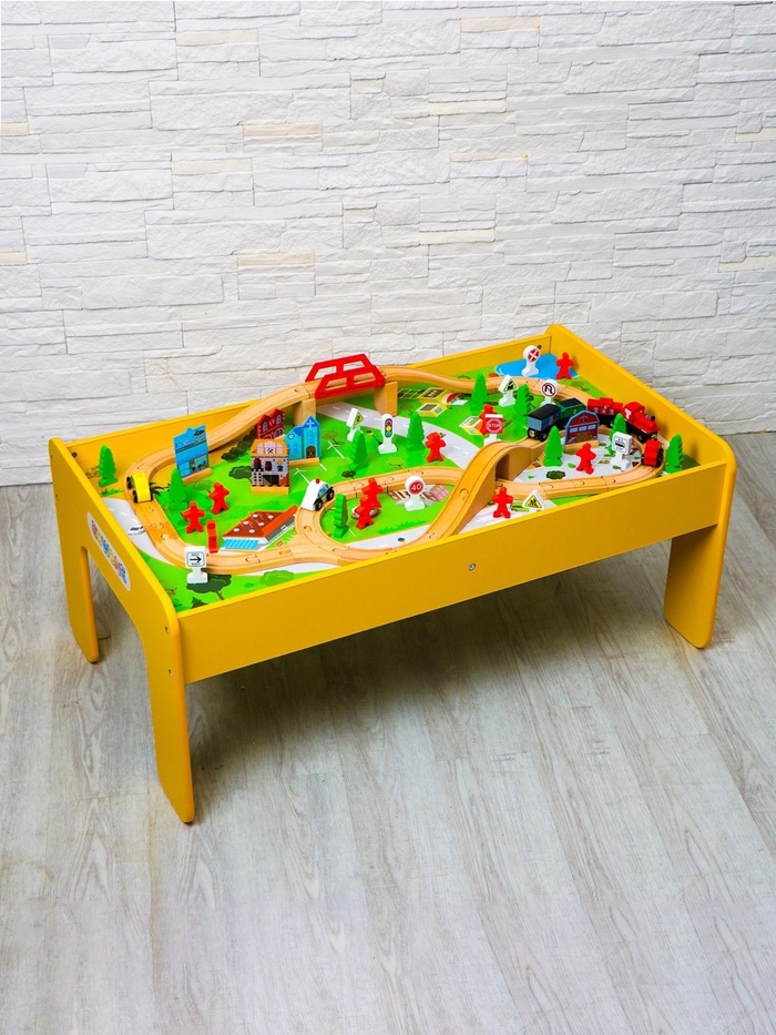 Железная дорога — это красочный набор для сюжетных игр. Большое количество декораций и фигурок позволяет собрать действующий комплекс с транспортной развязкой. Дорожное полотно можно укладывать на уровень выше основного положения рельсов, чтобы организовать многоуровневые съезды и мосты.