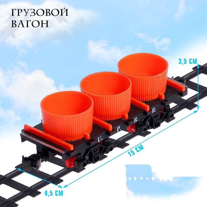 - Грузовые вагоны (2 шт.): 15 × 4,5 × 3,5 см.
