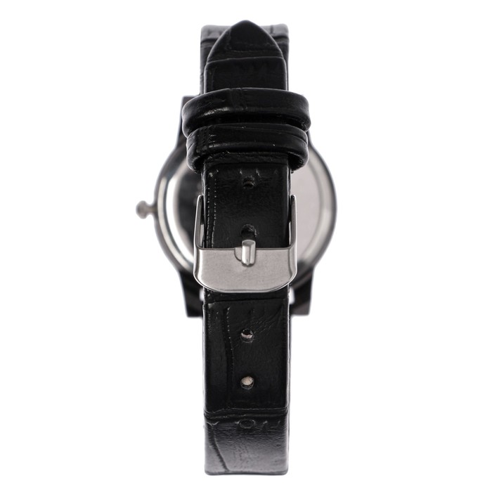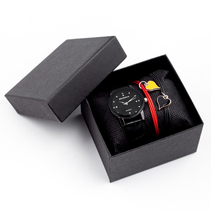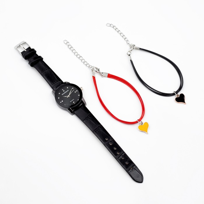 Набор мужских часов с массивным циферблатом в серебристой огранке дополнен браслетами черного и красного цвета, на каждом из которых расположены ключ и замок, как символ сокровенности и исключительности.