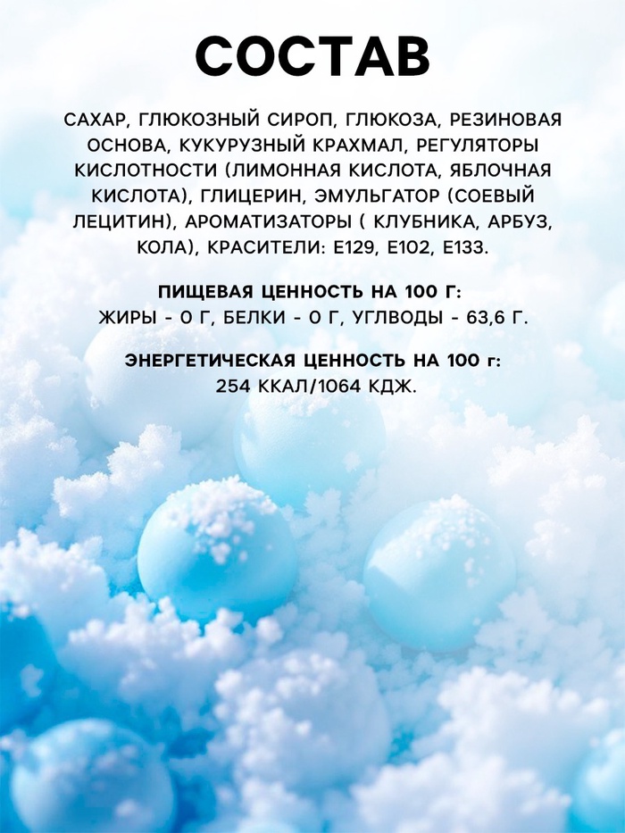 Состав: сахар, глюкозный сироп, глюкоза, резиновая основа, кукурузный крахмал, регуляторы кислотности (лимонная кислота, яблочная кислота), глицерин, эмульгатор (соевый лецитин), ароматизаторы ( клубника, арбуз, кола), красители: Е129, Е102, Е133. Срок годности: 36 месяцев Масса нетто: 15 г.