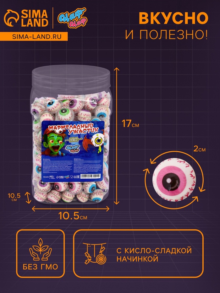 Мармеладные глаза "Чаф-Чаф" с начинкой — это оригинальное и забавное сладкое угощение, которое станет настоящим хитом среди любителей необычных десертов. Каждый мармелад весом 2 г оформлен в виде глаз, что добавляет игривости и веселья в процесс наслаждения сладким угощением.