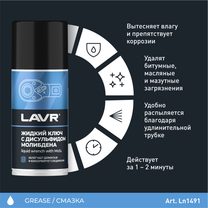 Жидкий ключ с дисульфидом молибдена облегчает демонтаж резьбовых соединений и смазывает трущиеся узлы. Защищает от износа и обеспечивает функциональность узлов, резьбы, шарниров, шестерен, цепей, слабонагруженных подшипников, петель, замков, задвижек, тяг и других подвижных механизмов. Имеет широкий диапазон рабочих температур и длительно сохраняет свойства после нанесения.