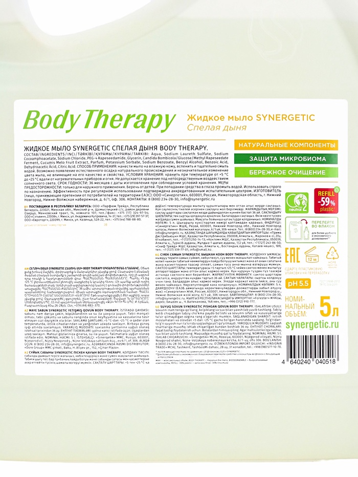 - Экономичный объем: Пятилитрового контейнера хватит надолго, что делает покупку выгодной и удобной. Вы сможете сократить частоту покупок и всегда иметь запас мыла на кухне или в ванной.