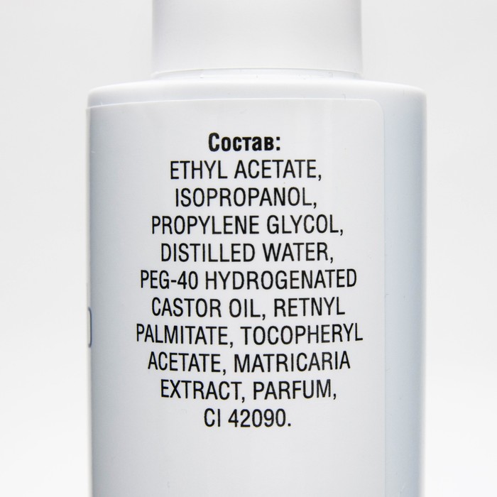 Состав: Ethyl Acetate, Isopropanol, Propylene Glycol, Distilled Water, Peg-40 Hydrogenated Castor Oil, Retnyl Palmitate, Tocopheryl Acetate, Matricaria Extract, Parfum, CI 42090.