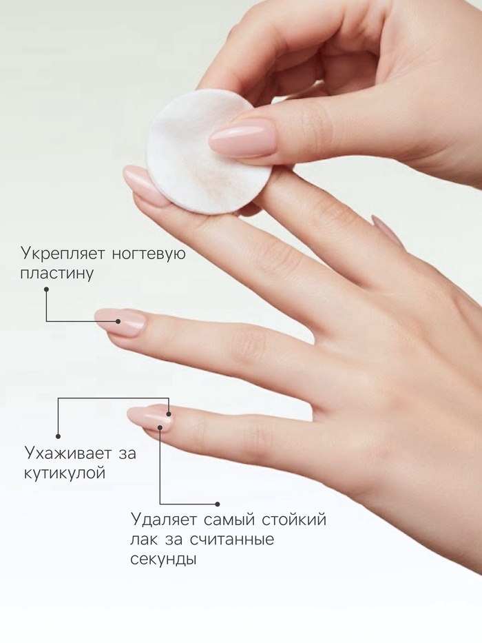 Эта ухаживающая формула создана не только для эффективного снятия лака, но и для заботы о состоянии ногтей и кутикулы. Благодаря сбалансированному составу средство мягко растворяет даже стойкие покрытия, при этом не пересушивает ногтевую пластину. Увлажняющие компоненты питают и смягчают кутикулу, а укрепляющие добавки помогают снизить ломкость ногтей и вернуть им естественный блеск.