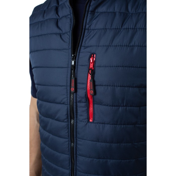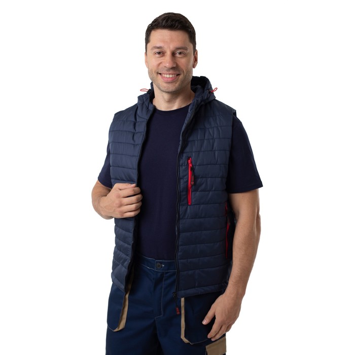 Жилет с капюшоном на подкладке выстеган с утеплителем. Центральная застёжка — молния. Три прорезных кармана с застёжкой на молнию. Удобный внутренний карман, регулировка ширины по низу изделия и регулировка объёма капюшона. Ткань верха: «Дюспо», отделка ВО (RW), PU MILKY, состав ткани: 100% полиэфир, плотность 90 г/м².