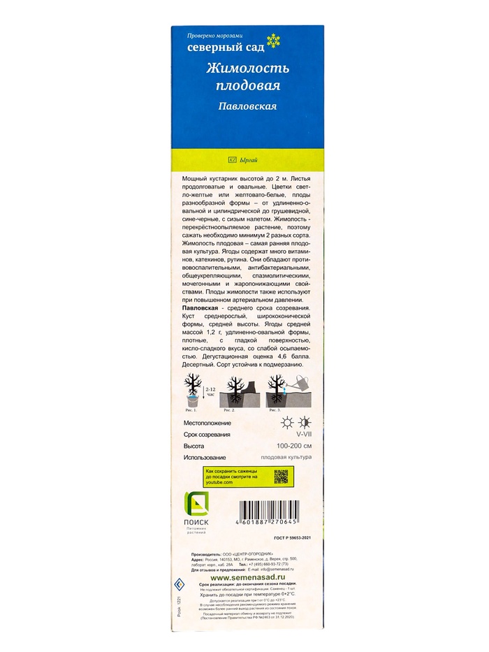 Жимолость съедобная (Серия Северный Сад) "Петр 1". Раннего срока созревания. Куст среднерослый, средней густоты, форма кроны полушаровидная. Однолетние побеги прямые, средней толщины, светло-зеленые,с антоциановой окраской и очень слабымопушением. Плоды довольно крупные (массой 0,9 — 1,0 г), кувшиновидные, фиолетово-синие, со слабобугристой поверхностью. Кожица средней толщины, мякоть среднеплотная. Транспортабельность ягод хорошая. Вкус кисло-сладкий, очень приятный, горечь отсутствует. Дегустационная оценка – 4,8 балла. Плоды универсального назначения. Сорт зимостойкий, жаростойкий и засухоустойчивый, слабовосприимчив к основным болезням и вредителям. Осеннее цветение отсутствует. Зрелые плоды не склоны к осыпанию.Самобесплоден. Лучшие сорта — опылители: Памяти Куминова, Антошка, Голубой десерт. Урожайность высокая – 1,9 — 2,4 кг/куст. Пригоден к индустриальной технологии возделывания с применением механизированной уборки урожая.