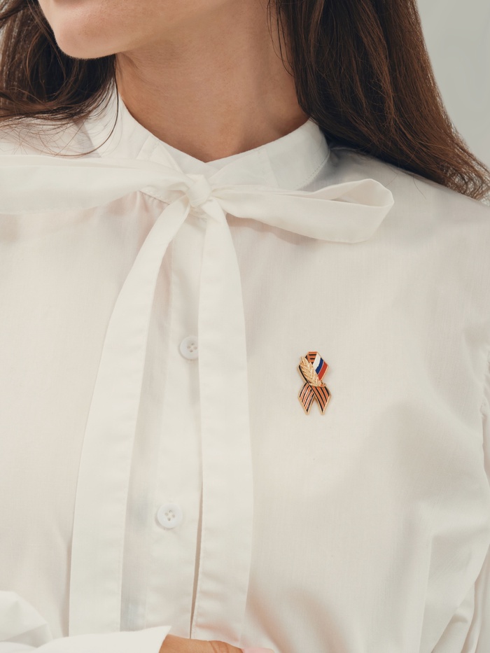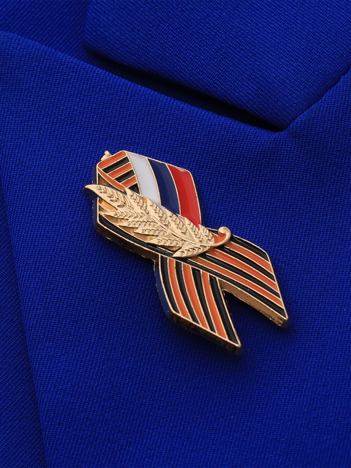 Значок «Георгиевская лента с флагом России», цветной в золоте