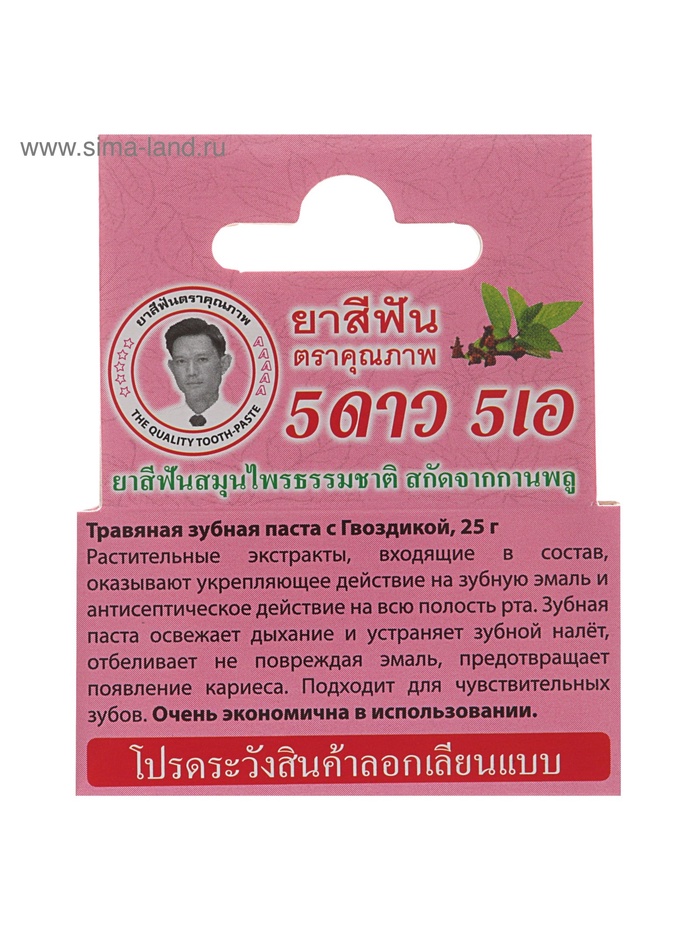 Зубная паста 5 Star Cosmetic с травами и гвоздикой — это натуральный продукт, который бережно отбеливает зубы, освежает дыхание и предотвращает возникновение кариеса и пародонтоза. В состав пасты входят карбонат кальция, глицерин, додецилсульфат натрия, ментол, камфора, масло гвоздики и борнеол.