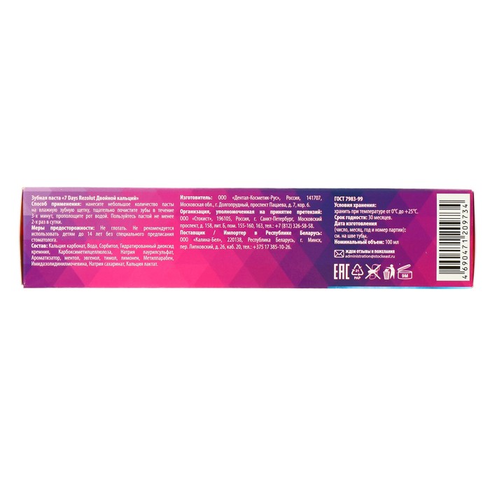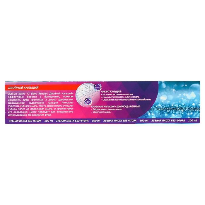 Зубная паста «7 Days Rezolut Двойной кальций» эффективно борется с бактериями, помогая сохранить зубы крепкими, а десны здоровыми. Повышенное содержание кальция помогает укрепить зубную эмаль. Паста эффективно счищает зубной налет не повреждая эмаль.