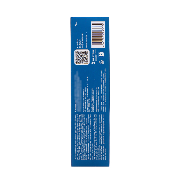 Состав: вода, кремния диоксид, сорбит, глицерин, ксилит, калия цитрат, кокамидопропилбетаин, ПЭГ-400, натрия лауроилсаркозинат, трикальций фосфат, аира экстракт, календулы экстракт, донника экстракт, ароматизатор, титана диоксид, термальная грязь, натрия карбоксиметилцеллюлоза, натрия метилпарабен, папаин, натрия сахаринат, лимонная кислота, ксантановая камедь, натрия пропилпарабен, краситель синий блестящий.