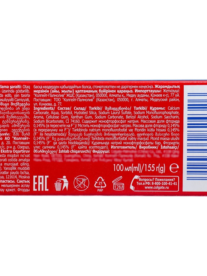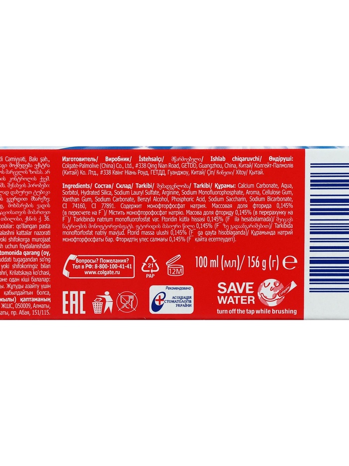 Состав: Calcium Carbonate Aqua Sorbitol Hydrated Silica Sodium Lauryl Sulfate Arginine Sodium Monofluorophosphate Aroma Cellulose Gum Xanthan Gum Sodium Carbonate Benzyl Alcohol Phosphoric Acid Sodium Saccharin Sodium Bicarbonate CI 74160 CI 77891.