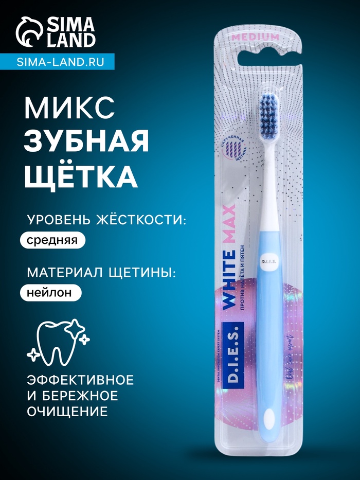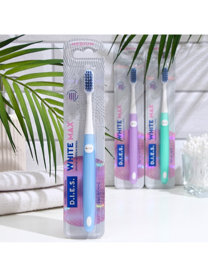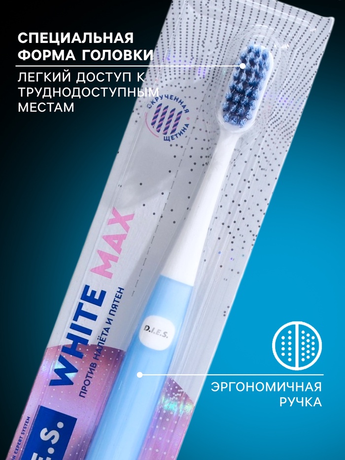 Описание: зубная щетка "D.I.E.S. WHITE MAX" против налета и пятен. Каждая скрученная щетинка состоит из двух скрученных жгутом волокон, где работают не только кончики, но и боковые поверхности щетинок. Поэтому очищающая способность такой щетины в несколько раз выше обычной. Закруглённый кончик каждой щетинки тщательно отполирован, поэтому щётка не повреждает дёсны и эмаль. Ровная форма подстрижки щетины увеличивает рабочую поверхность, обеспечивая максимальный контакт со всеми участками поверхности зуба и качественное удаление зубного налёта. Эргономичная ручка, покрытая силиконом, обеспечивает отсутствие скольжения во время использования.