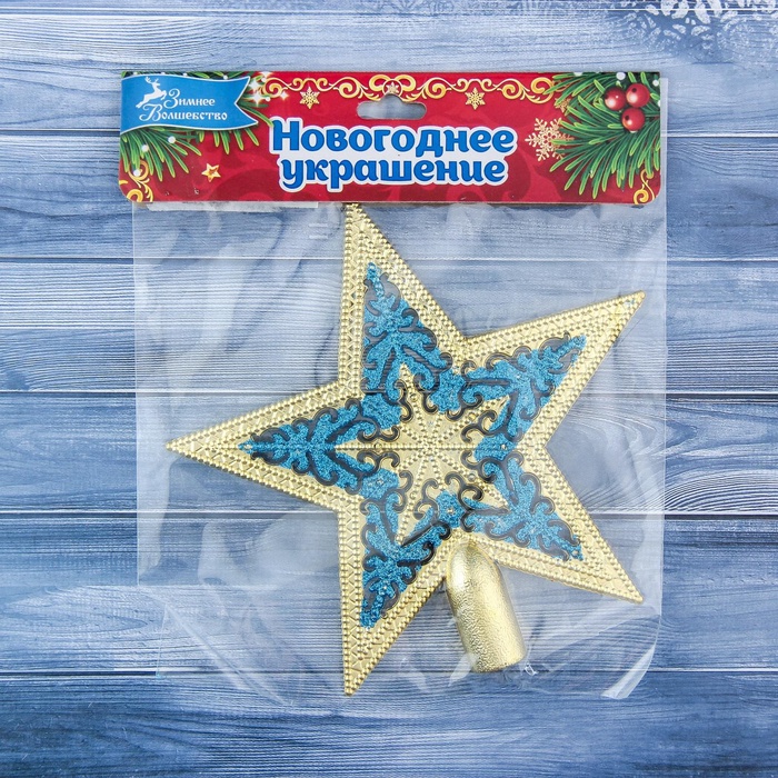 Верхушка для новогодней ёлки с резным кружевным узором в стиле фьюжн сочетает золотистый и синий цвета, создавая изящный акцент высотой 15 см. Этот пластиковый наконечник украшает праздничное дерево, придавая ему лёгкость и элегантность.